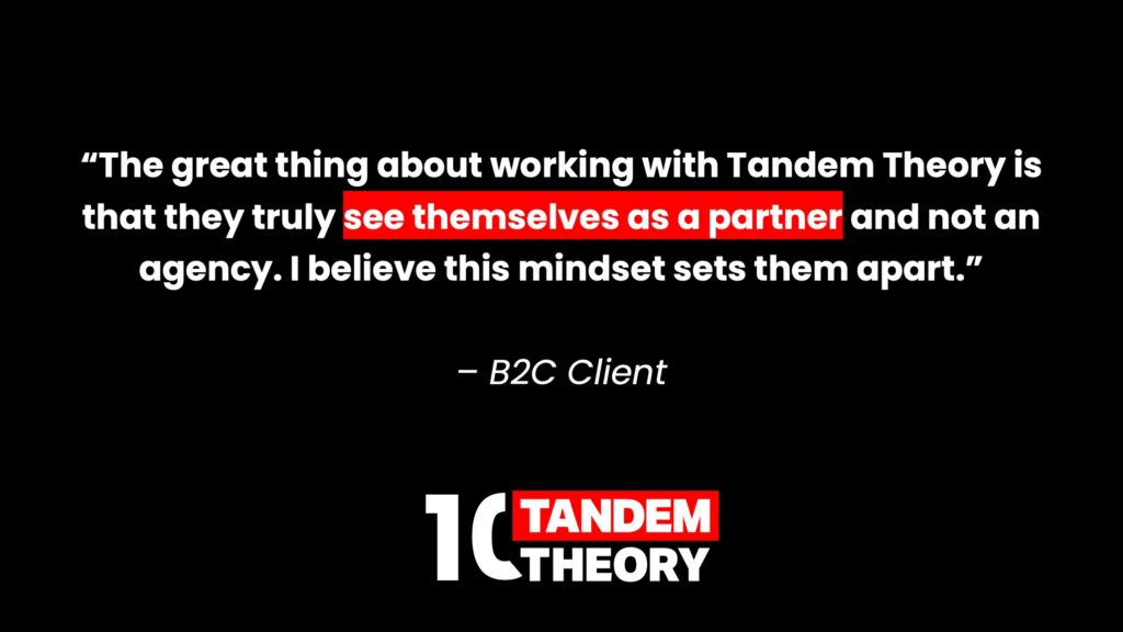 “The great thing about working with Tandem Theory is that they truly see themselves as a partner and not an agency. I believe this mindset sets them apart. The team is dedicated not only in understanding the tasks at hand but is also very strategic in how we push forward and advance the work and therefore the business. The genuine curiosity of the analytics team is also refreshing.” – B2C Client